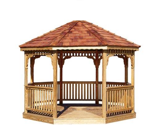 Octagonal pavilon with 10x10cm thick beams, a double roof and black shingles, with a tower without a base plate